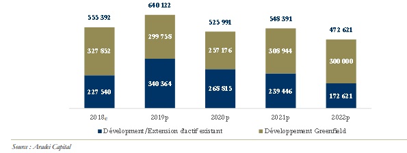 «Comme présenté sur le graphique ci-dessus, la répartition des investissements en interne est homogène sur la durée d’investissement du plan stratégique. En effet, Aradei Capital investira en moyenne, sur les cinq prochaines années, légèrement moins de la moitié du budget de son plan stratégique dans le développement et l’extension des galeries commerciales et autres biens d’exploitation. Le reliquat sera dédié à la création de nouveaux projets dans le cadre de sa croissance Greenfield», détaille la société.