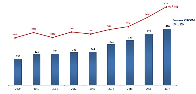 La DG estime que l’encours des actifs sous gestion d’OPCVM a crû significativement sur la période 2009-2017 en réalisant une croissance annuelle moyenne aux alentours de 10% pour atteindre plus de 420 MMDH, soit 40% du PIB marocain.