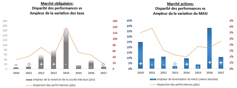 Les résultats démontrent une corrélation entre la disparité de la performance et la variation du marché et son ampleur. Notons que, sur le marché obligataire, cette corrélation est beaucoup plus prononcée que sur le marché actions (voir graphiques ci-dessous).
