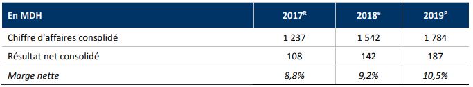 Le résultat net consolidé devrait passer de 108 MDH en 2017 à 142 MDH en 2018, soit une hausse anticipée de 31,48%. En 2019, il devrait augmenter de plus de 31% pour se situer à 187 MDH. (Voir tableau ci-dessous)