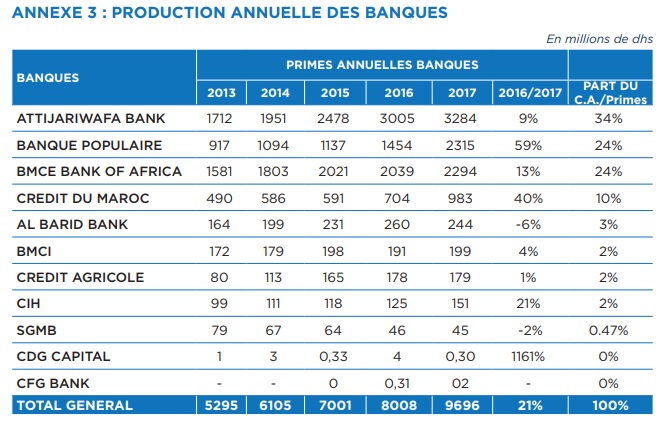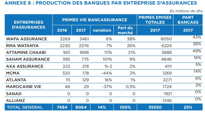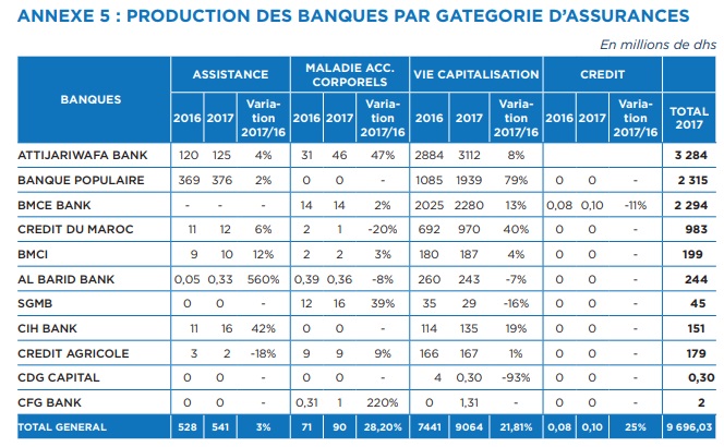 En 2017, l’activité de la bancassurance a enregistré une progression de 21% par rapport à 2016, pour atteindre un montant de 9,7 MMDH, selon les chiffres publiés par l’ACAPS. Les trois premières banques qui présentent des opérations d’assurances sont AWB, BCP et BMCE Bank (voir tableau ci-dessous).