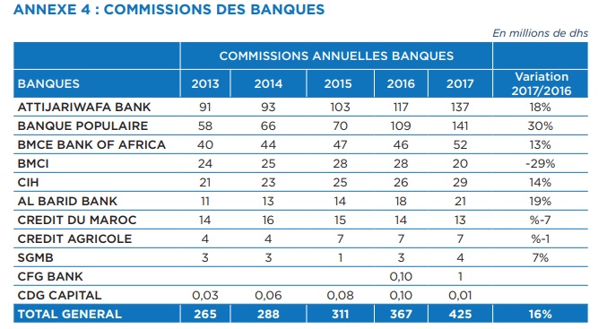 Les commissions encaissées par les banques au titre de l’exercice 2017 ressortent à 425 MDH, en progression de 16% par rapport à 2016 (voir tableau ci-dessous).