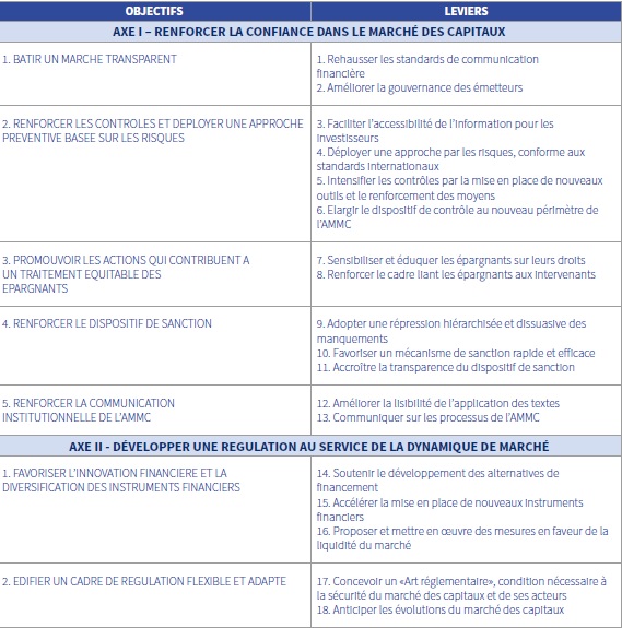 "L’élaboration du plan stratégique de l’AMMC repose sur deux piliers essentiels: la conformité et le développement", souligne l'autorité dans son rapport annuel de 2017. "Le programme d’action qui en découle vise à refléter les nouveaux rôles de régulation attribués à l’autorité, mais inscrit aussi le plan dans une dynamique qui contribue au développement du marché, afin de le positionner comme levier important du financement de l’économie".