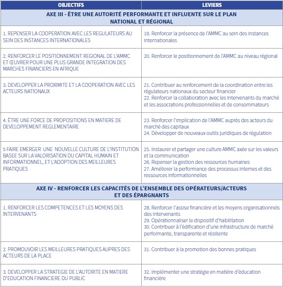 Le plan stratégique de l'AMMC se décline en 4 axes visant 15 objectifs différents qui renvoient à 32 actions spécifiques, que voici: