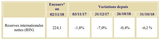 Les réserves internationales nettes (RIN) ont enregistré, d’une semaine à l’autre, une baisse de 0,4% pour revenir à 224,1 MMDH au 2 novembre 2018.