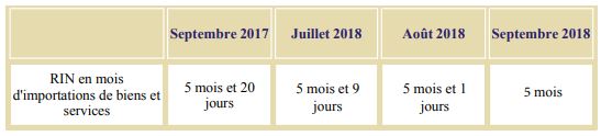 Les RIN en mois d’importations de biens et services se sont établies à 5 mois à fin septembre 2018, contre 5 mois et 20 jours pendant la même période de l’année précédente.