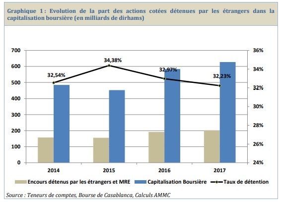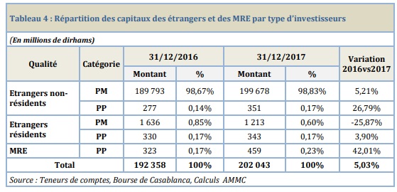 En montants investis, les capitaux étrangers ont augmenté de 5% en passant de 192,36 MMDH en 2016, à 202 MMDH en 2017. Selon l’AMMC, cette progression est expliquée à hauteur de 98% par la hausse des prix des actions cotées composant les portefeuilles des étrangers.