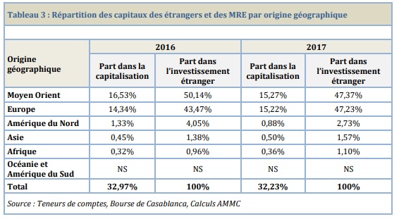 Par origine d’investisseurs, ceux d’Europe et du Moyen-Orient représentent plus de 94% de l’investissent global des étrangers et presque 31% de la capitalisation boursière.