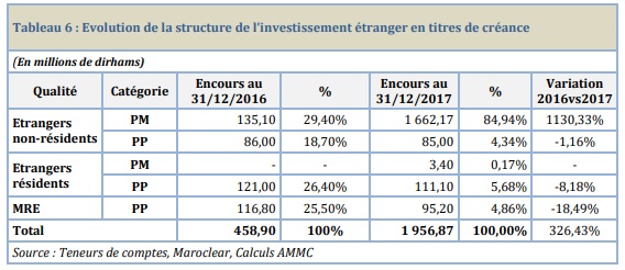 Par ailleurs, l’encours de titres de créance détenus par les étrangers et les MRE à fin 2017 s’est élevé à 1,9 MMDH, alors que l'encours global se situe aux alentours de 727 MMDH (calculé par nos soins). Presque 85% de l’encours appartient aux personnes morales étrangères non résidentes, suivies par les personnes physiques non résidentes (4,34 %).