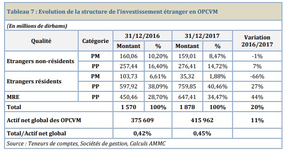 De l’autre côté, le montant de l’investissement étranger en titres d’OPCVM a atteint 1,88 MMDH contre 1,57 MMDH une année auparavant, enregistrant une hausse de 20%. Il est à noter que l'encours global géré par les OPCVM est de l'ordre de 415 MMDH à fin 2017, d'après nos recherches.