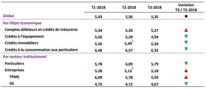 Par secteur institutionnel, les taux appliqués aux crédits accordés aux entreprises ont progressé de 6 pbs à 5,18%, reflétant principalement une hausse de 15 pbs à 5,93% des taux assortissant les prêts aux très petites, petites et moyennes entreprises (TPME), ceux appliqués aux grandes entreprises (GE) ayant reculé de 5 pbs à 4,67%.