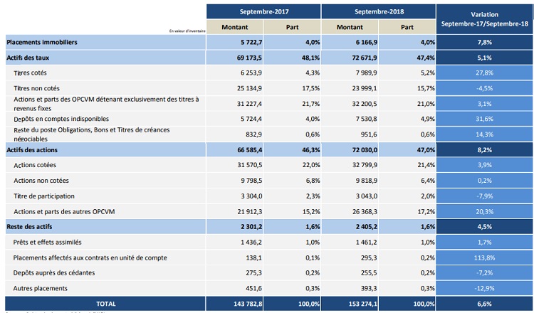 Ci-dessous les encours des placements affectés du secteur des assurances par nature d'actif à fin septembre 2018: