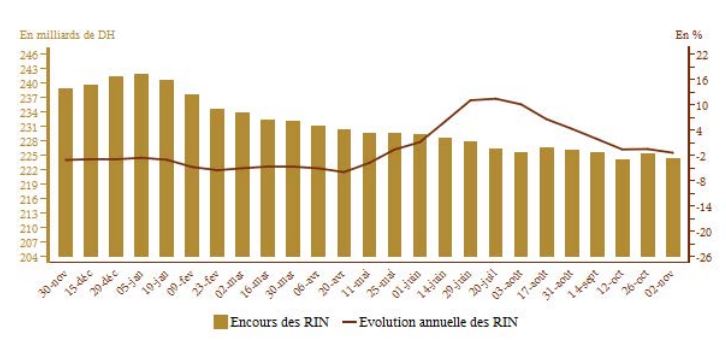 Au 2 novembre 2018, les RIN affichent un encours de 224,1 MMDH, accusant une légère baisse de 1,8% en glissement annuel, d’après les dernières statistiques hebdomadaires de Bank Al Maghrib.