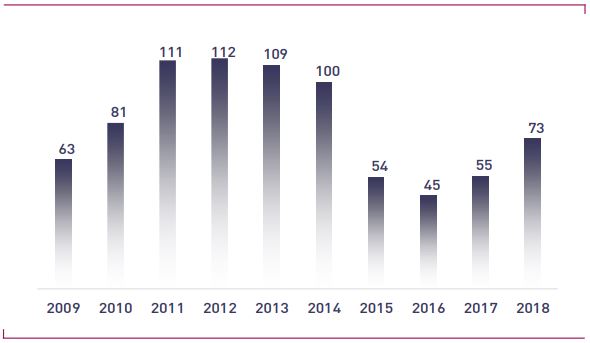 Durant le mois d’octobre 2018, le prix du pétrole Brent a atteint un pic de 86,7 $ le baril, son plus haut niveau depuis 4 ans. Le baril affiche un niveau moyen annuel de 73 $ contre 55 $ en moyenne pour l’année 2017, soit une hausse de 33%.