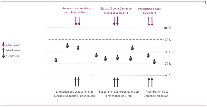 Voici le schéma regroupant les facteurs haussiers et baissiers qui profilent le comportement actuel du prix du Pétrole: