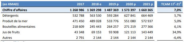 > Activité Produits de la mer : croissance annuelle moyenne du chiffre d’affaires de 5% liée à la migration vers des produits (sardine SPSA et maquereau) et des marchés (notamment en Afrique) à plus forte valeur ajoutée et avec de meilleures marges. La nouvelle stratégie commerciale consiste à signer des contrats d’importations et de distribution portant sur des marchés importants et non fragmentés ;