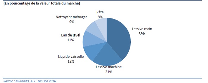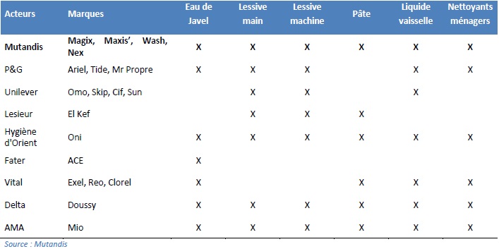 Mutandis s'est certainement construit une notoriété particulière dans les détergents, alors qu'elle opère dans les cinq segments principaux de ce marché: L'eau de Javel, la lessive (main et machine), la pâte, le liquide vaisselle, et le nettoyant ménager.