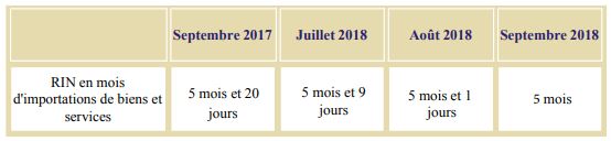 Les RIN en mois d’importations de biens et services se sont établies à 5 mois à fin septembre 2018, contre 5 mois et 20 jours pendant la même période de l’année précédente.