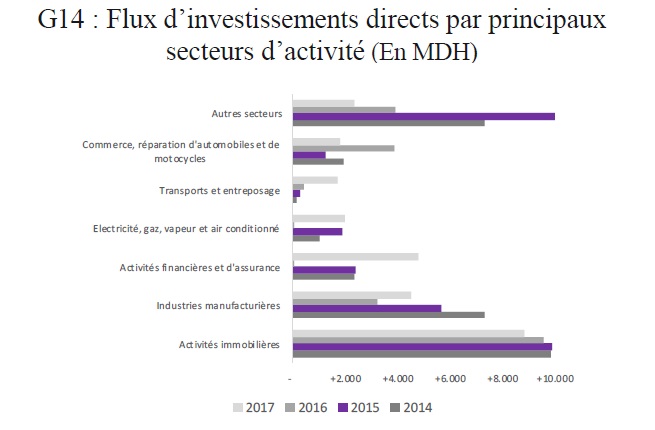 Les trois premiers secteurs passent d’une part de 61,1% du total des flux d’investissements directs étrangers au Maroc en 2016, à 69,7% en 2017, soit un gain de 8,6 points.