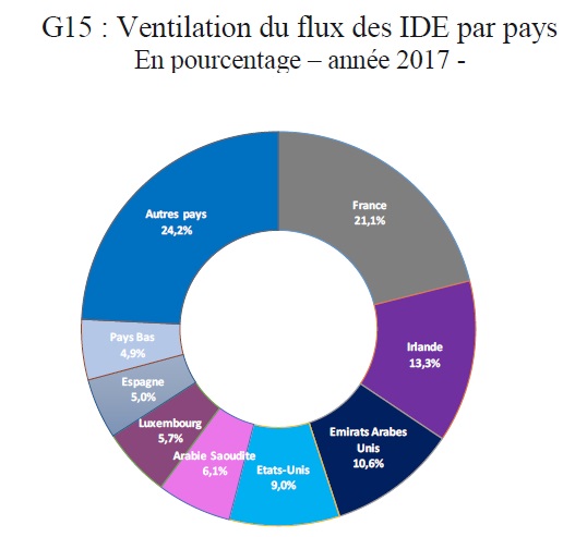 S’agissant de la répartition par pays, la France demeure le principal pays de provenance des flux d’IDE en 2017 avec 5,5 MMDH, suivie de l’Irlande avec 3,5 MMDH (ce pays abrite le siège de plusieurs multinationales en raison de son système fiscal attractif). Ces deux pays représentent 34,4% du flux total des IDE en 2017.