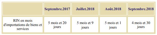 Les RIN en mois d’importations de biens et services se sont établies à 4 mois et 30 jours à fin septembre 2018, contre 5 mois et 20 jours pendant la même période de l’année précédente.