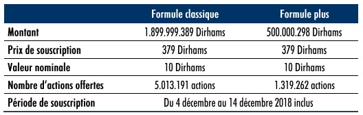 Selon la note d'information du groupe, l'opération portera sur un montant nominal de 63,3 MDH par émission de 6.332.453 actions nouvelles d’une valeur nominale de 10 dirhams chacune, à émettre à un prix de souscription (prime d’émission incluse) de 379 dirhams par action.