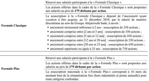 Pour la formule Plus, l’acquisition par les salariés des actions pourra être financée à hauteur de 85% au moyen d’un prêt en plus d’un apport personnel de 15% ou bien totalement par apport en espèce. Ainsi, un financement par Attijariwafa bank, à un taux conventionnel, sera proposé aux collaborateurs qui en émettent le souhait, précise-t-on.