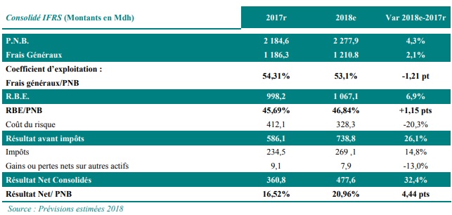 Le résultat brut d’exploitation (RBE) et le produit net bancaire (PNB) devraient progresser respectivement de 6,9% et de 4,3% en glissement annuel, pour atteindre 1,06 MMDH et 2,27 MMDH à fin 2018.