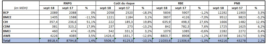 Le résultat brut d'exploitation agrégé s’élève à plus de 21 MMDH à fin septembre 2018, en baisse de 1,3% comparativement à la même période en 2017.