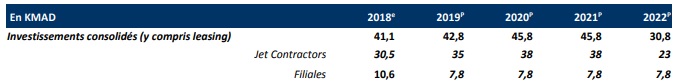 Les investissements prévus de Jet Contractors totalisent un montant de 146 MDH. Ils concernent exclusivement le maintien de son outil de production. En intégrant les investissements financés en leasing, le total investissement ressort à 221 MDH, réparti comme suit :