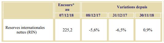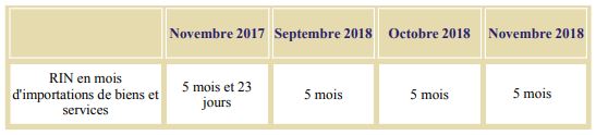 Les RIN en mois d’importations de biens et services se sont établies à 5 mois à fin novembre 2018, contre 5 mois et 23 jours pendant la même période de l’année précédente.