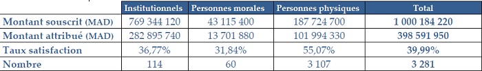 – le nombre d’actions demandées est de 5.556.579, soit un montant global souscrit de 1.000.184.220 Dh;
