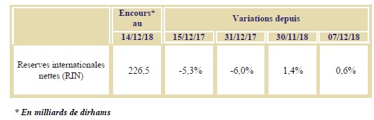 Les réserves internationales nettes (RIN) ont progressé de 0,6%, d’une semaine à l’autre, pour s’établir à 226,5 MMDH au 14 décembre 2018.