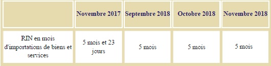 Les RIN en mois d’importations de biens et services se sont établies à 5 mois à fin novembre 2018, contre 5 mois et 23 jours pendant la même période de l’année précédente.