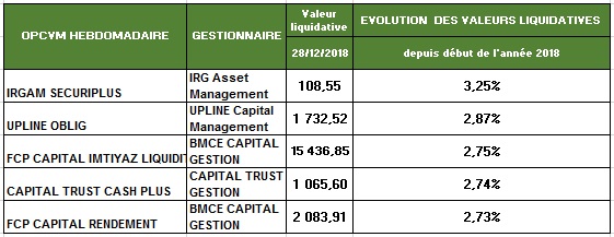 Du côté des OPCVM monétaires, la performance des fonds se situe dans une fourchette allant de -3,34% (RMA Tréso Plus, un fonds géré par RMA Asset Management) à 2,77%, une performance à mettre à l'actif de Valoris Management et son fonds Emergence Cash.