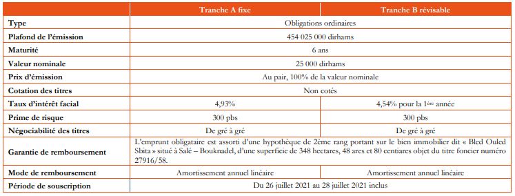 A noter que cet emprunt est assorti d’une hypothèque de 2ème rang à hauteur de 454,02 MDH (l’hypothèque) portant sur le bien immobilier dit « Bled Ouled Sbita » situé à Salé – Bouknadel.