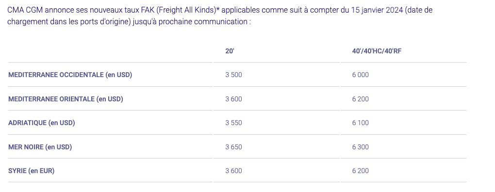 L’armateur français CMA-CGM a annoncé sa nouvelle grille tarifaire pour le transport des conteneurs 20 et 40 pieds, dans un communiqué publié le 2 janvier. Les tarifs passent de 3.000 à plus de 6.000 $ pour le 40 pieds, et de 2.000 à plus de 3.500 $ pour le 20 pieds.