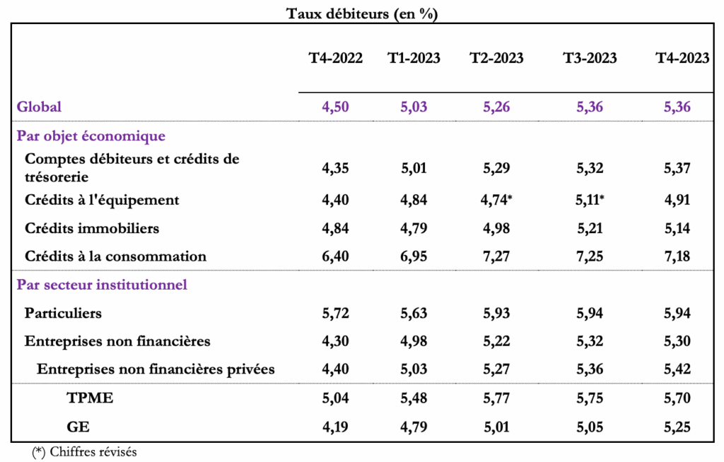 Par secteur institutionnel, le taux appliqué aux crédits aux particuliers s’est situé à 5,94% et celui des prêts aux entreprises non financières à 5,30%. Pour les crédits aux entreprises non financières privées, le taux les assortissant s’est établi à 5,42%, avec un taux de 5,25% pour les grandes entreprises (GE) et de 5,70% pour les très petites, petites et moyennes entreprises (TPME).