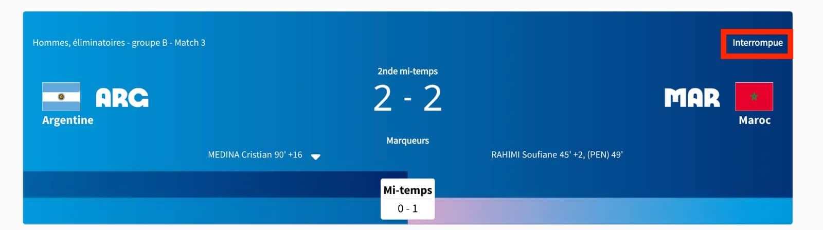Plusieurs sources de premier plan comme Radio Mars, BeIn Sports et Eurosport annoncent toutes que le match Maroc-Argentine n’est pas considéré comme terminé. La pelouse a été envahie après le deuxième but argentin par des supporters. L’arbitre n’a ni sifflé la validité du but ni consulté la VAR. Les mêmes sources rapportent qu’un hors-jeu a peut-être entaché ce but.