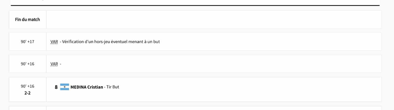 « Le coup de sifflet final n’a pas encore été officiellement donné. Le score est de 2-2 pour l’instant », a d’abord indiqué le site des JO, en faisant référence à une vérification de la VAR pour un possible hors-jeu sur l’égalisation des Argentins, comme le prouve les captures d’écran suivantes :