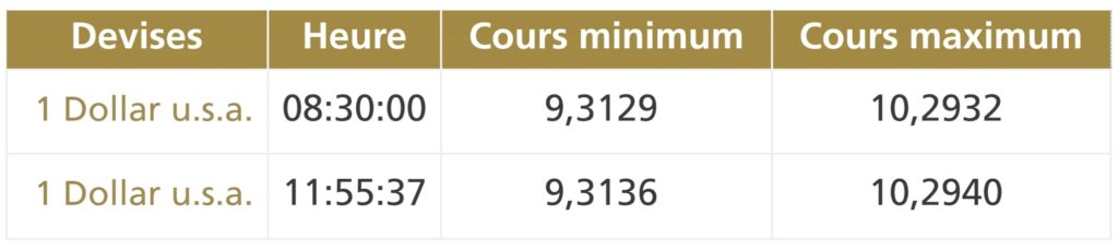 Ce jeudi 3 octobre vers 8h30, la première cotation centrale USD/MAD de la journée, telle que publiée par Bank Al-Maghrib (BAM), fait ressortir la bande de fluctuation suivante : Ci-après...