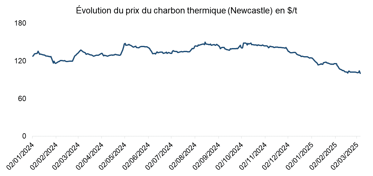 Entre 2021 et 2022, le prix du charbon avait connu une hausse sans précédent, atteignant des sommets historiques en raison de la crise énergétique mondiale, exacerbée par la guerre en Ukraine où le charbon-vapeur avait atteint un sommet record avoisinant 384 $/tonne à l’été. Les prix avaient progressivement diminué pour atteindre environ 243 $ en décembre 2022.