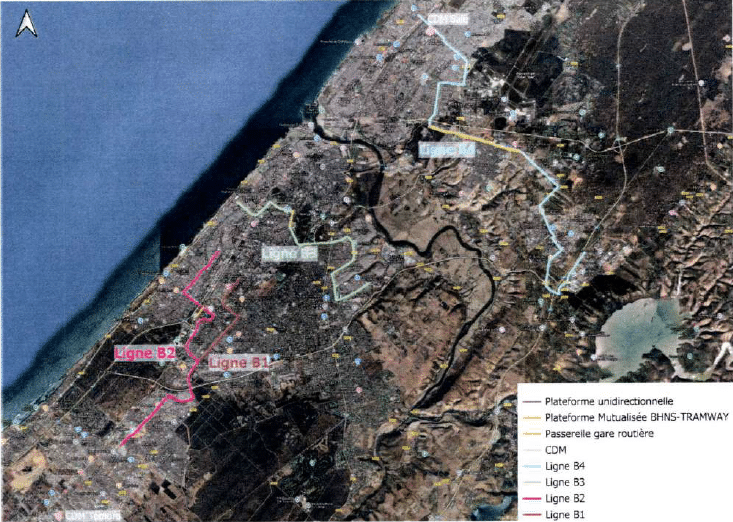 - BHNS1 (B1) : desserte de la ville de Témara à partir du terminus de la ligne de tramway T1 à Al Irfane, sur un linéaire de 9 km.