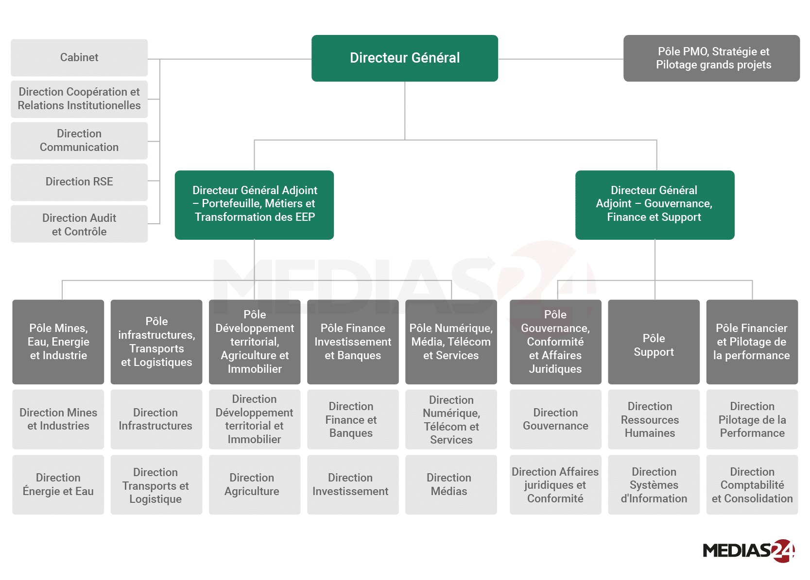 Parmi ces prérogatives, l’élaboration de la politique actionnariale de l’État, l’amélioration de la gouvernance et la professionnalisation, la modernisation des organes délibérants, la promotion de la culture de la performance, la restructuration des EEP en difficulté financière, et également la mise en place d’une stratégie de collaboration avec le secteur privé dans le cadre des PPP [partenariats public-privé].